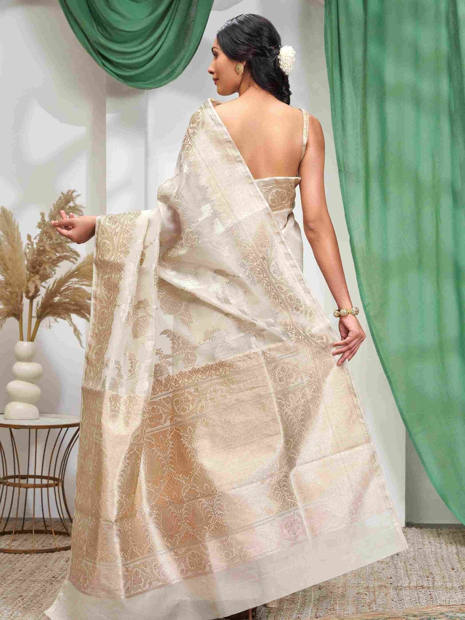 The defining feature of this masterpiece is the meticulous Kadwa Jangla weaving technique, one of the most labor-intensive and refined methods in Banarasi weaving. This technique ensures that every motif stands out with individuality and precision, unbroken by floats or carried threads. Embellished with Sona Rupa zari—a luxurious blend of gold and silver tones—the floral jaal (all-over) pattern glistens across the ivory base like a celestial garden.