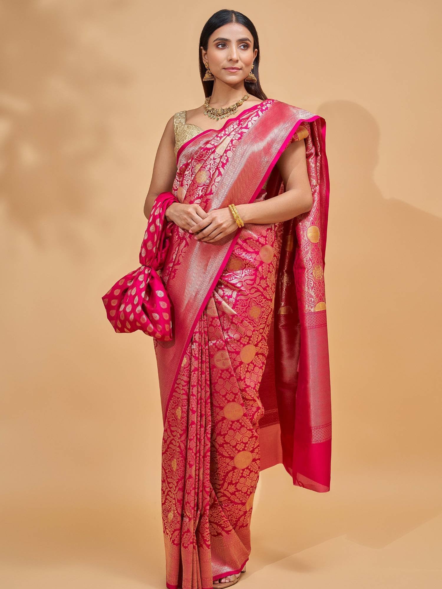 Experience the timeless artistry of Banaras with the Tanishka (Brocade Pink Jangla Saree) — a perfect blend of traditional craftsmanship and contemporary elegance. This saree is a revival of the age-old Banarasi Brocade weaving technique, brought to life with a graceful Jangla pattern that has roots in India’s rich textile history. The intricate motifs adorning the saree are inspired by vintage handloom styles, tailored for today’s modern bride or any woman who loves to make a statement in elegance.