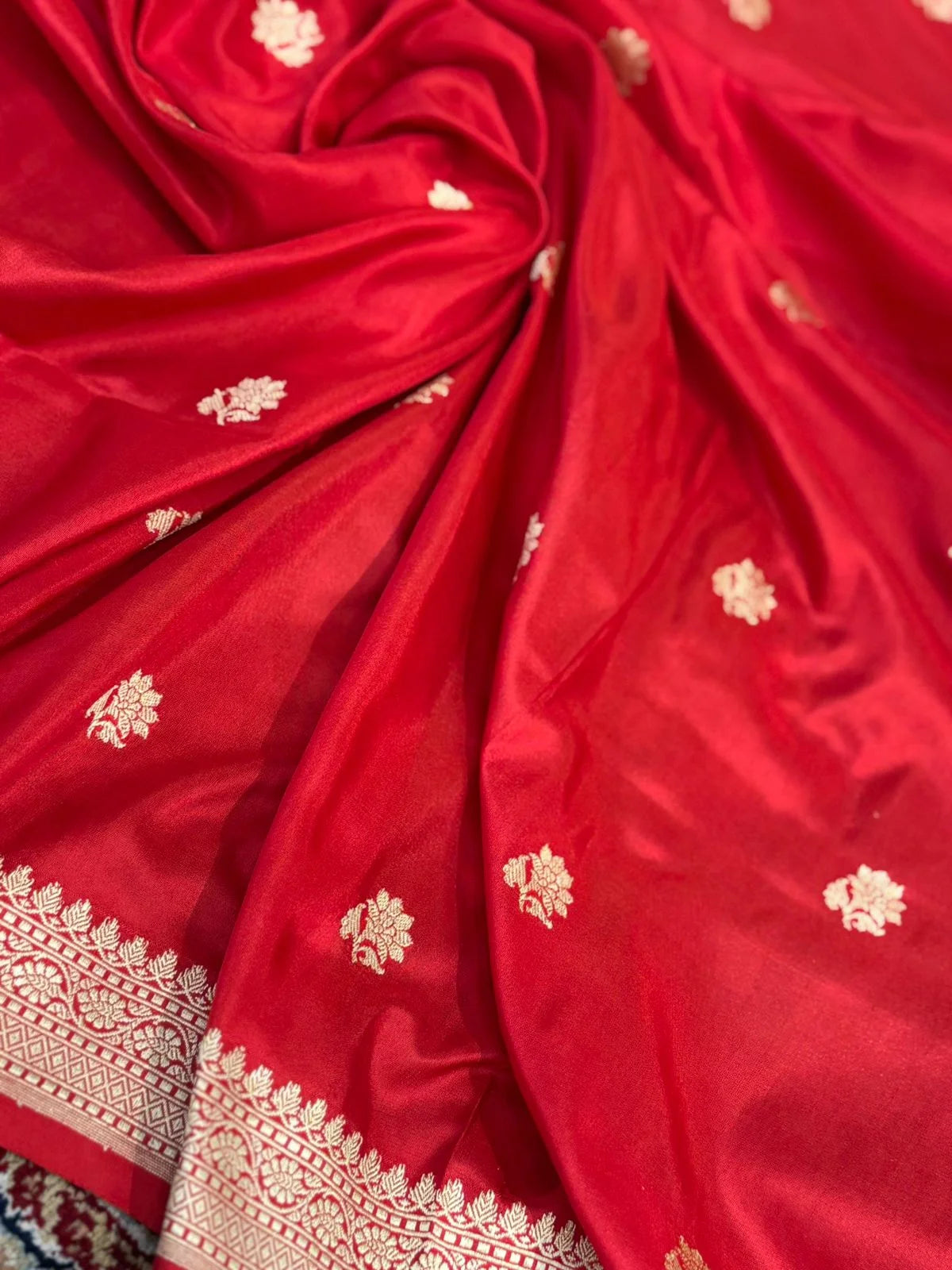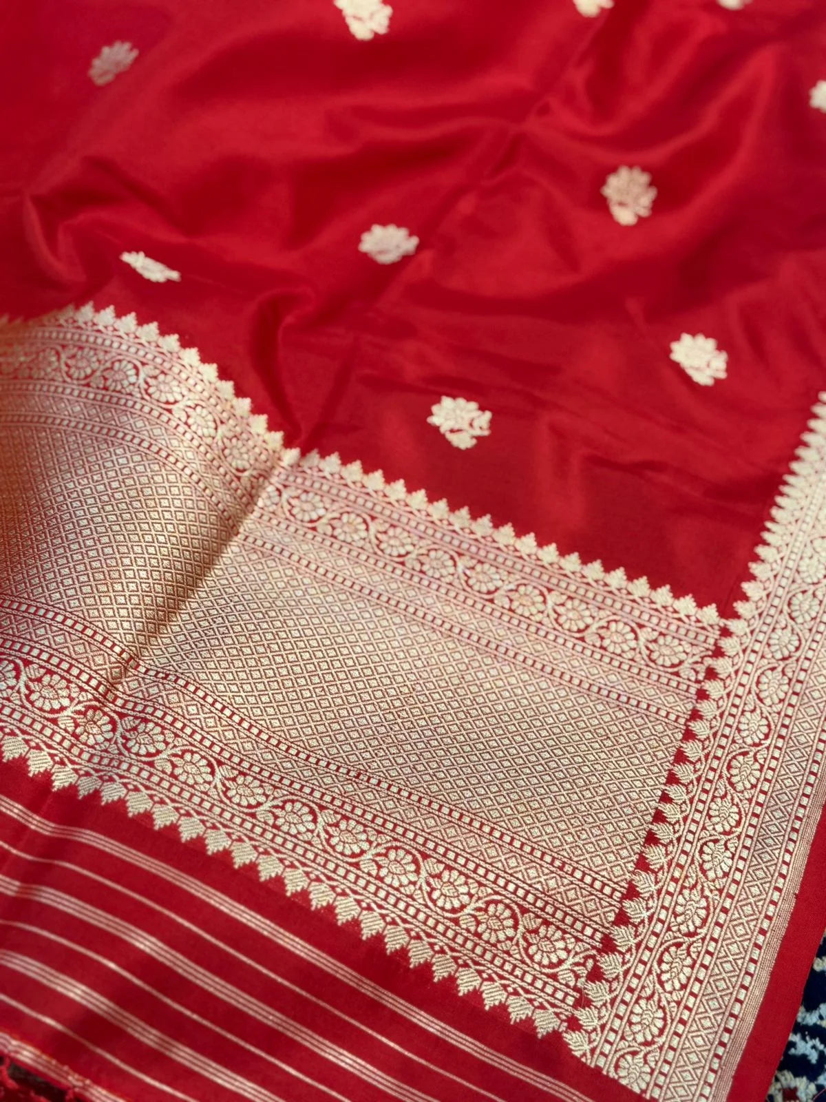 Woven from pure Katan silk, known for its smooth texture and natural sheen, the dupatta feels as luxurious as it looks. The fine kadwa boota motifs scattered throughout its length are not embroidered but handwoven directly into the fabric, showcasing exceptional weaving precision that only a few master artisans can achieve.