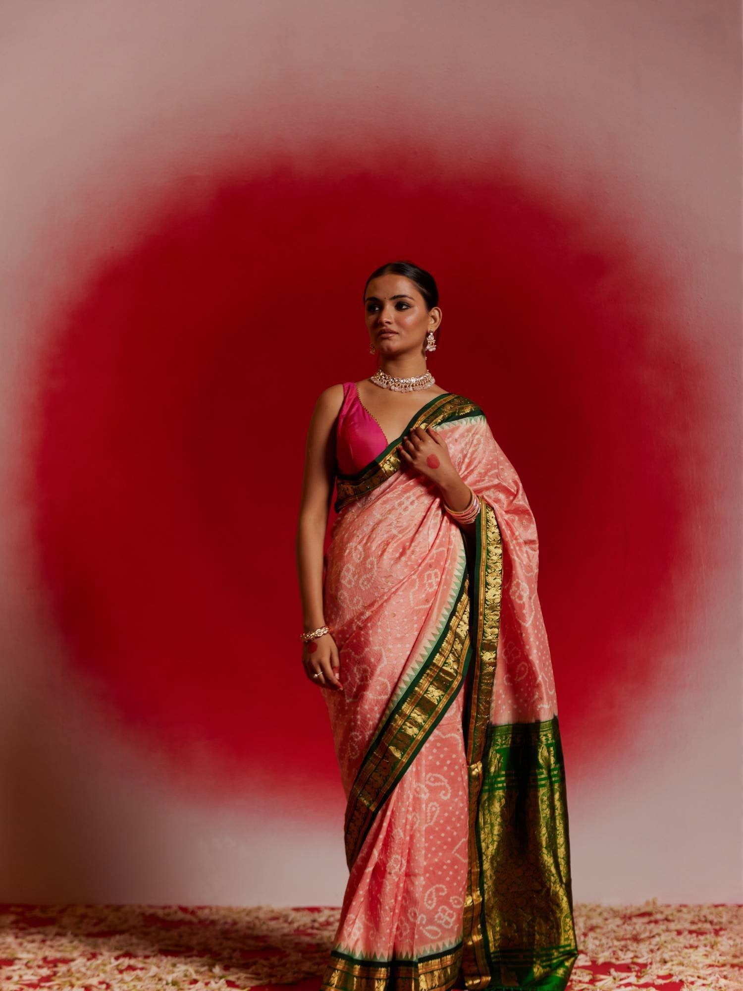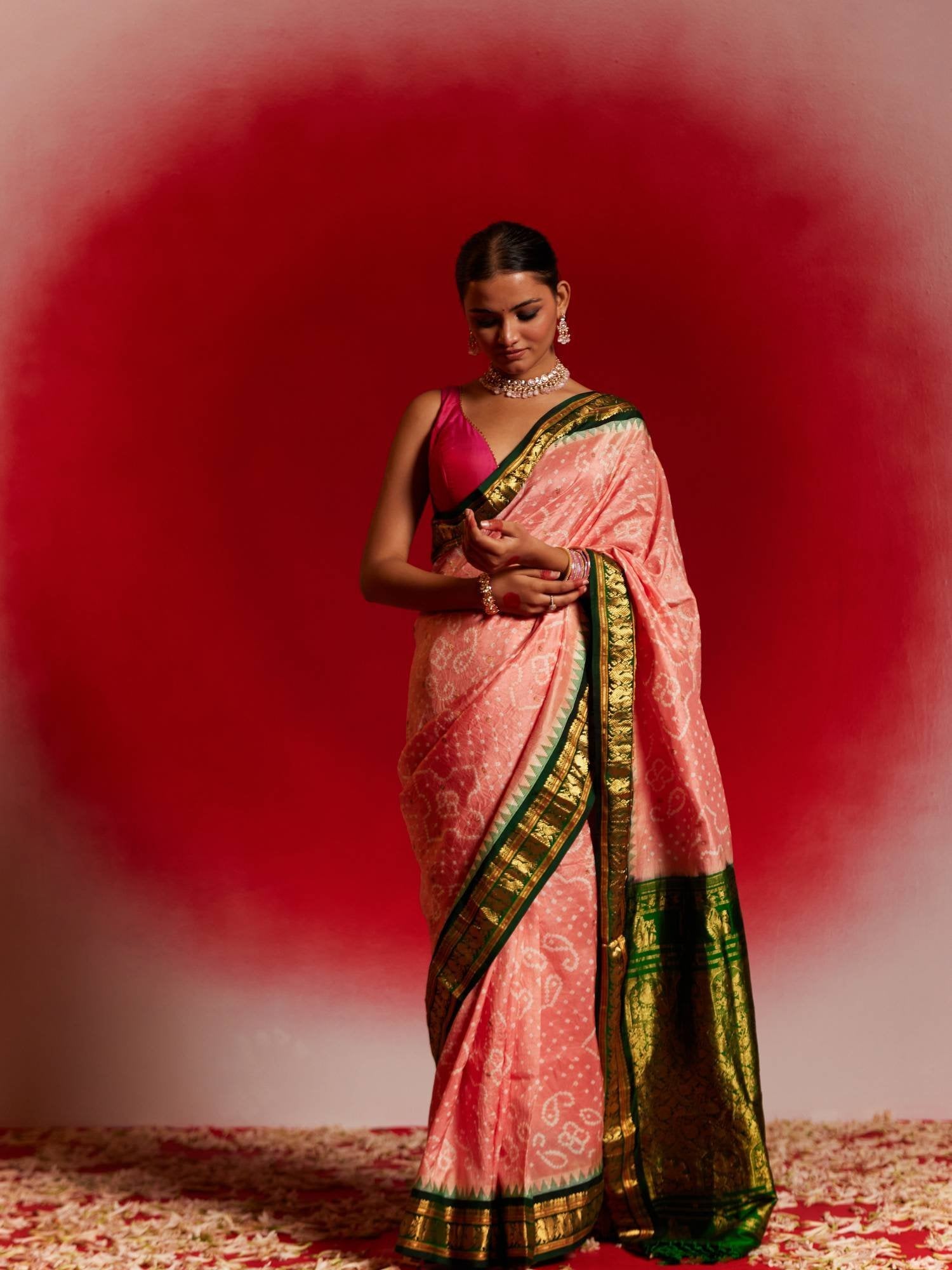 The body of this saree is woven from pure Kanjivaram silk—renowned for its opulent texture and durability—while the Bandhini pattern, achieved through authentic tie-and-dye technique, adds an ethereal charm. Each knot and dye spot is handcrafted with precision, resulting in a poetic pattern that flows like rhythm on silk. The stunning interplay of soft and bright hues—primarily in shades of pink—lends a unique vibrancy that makes this saree ideal for exclusive gatherings and grand occasions.