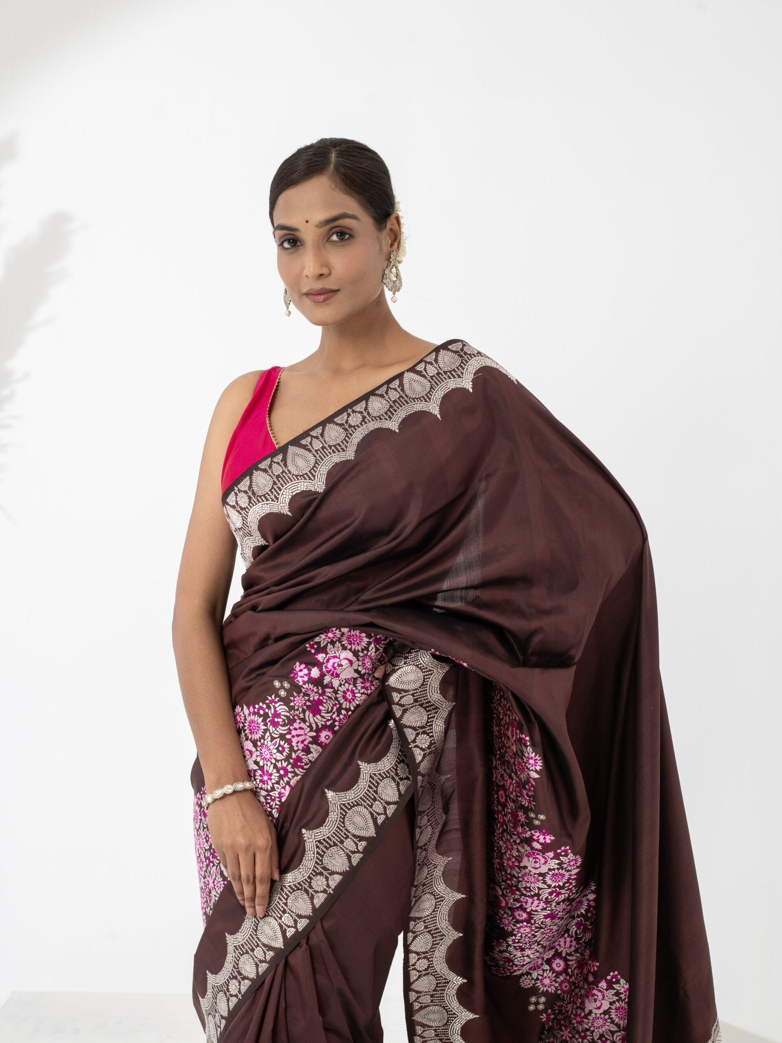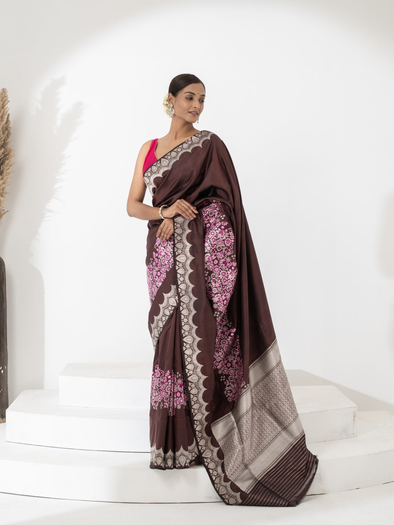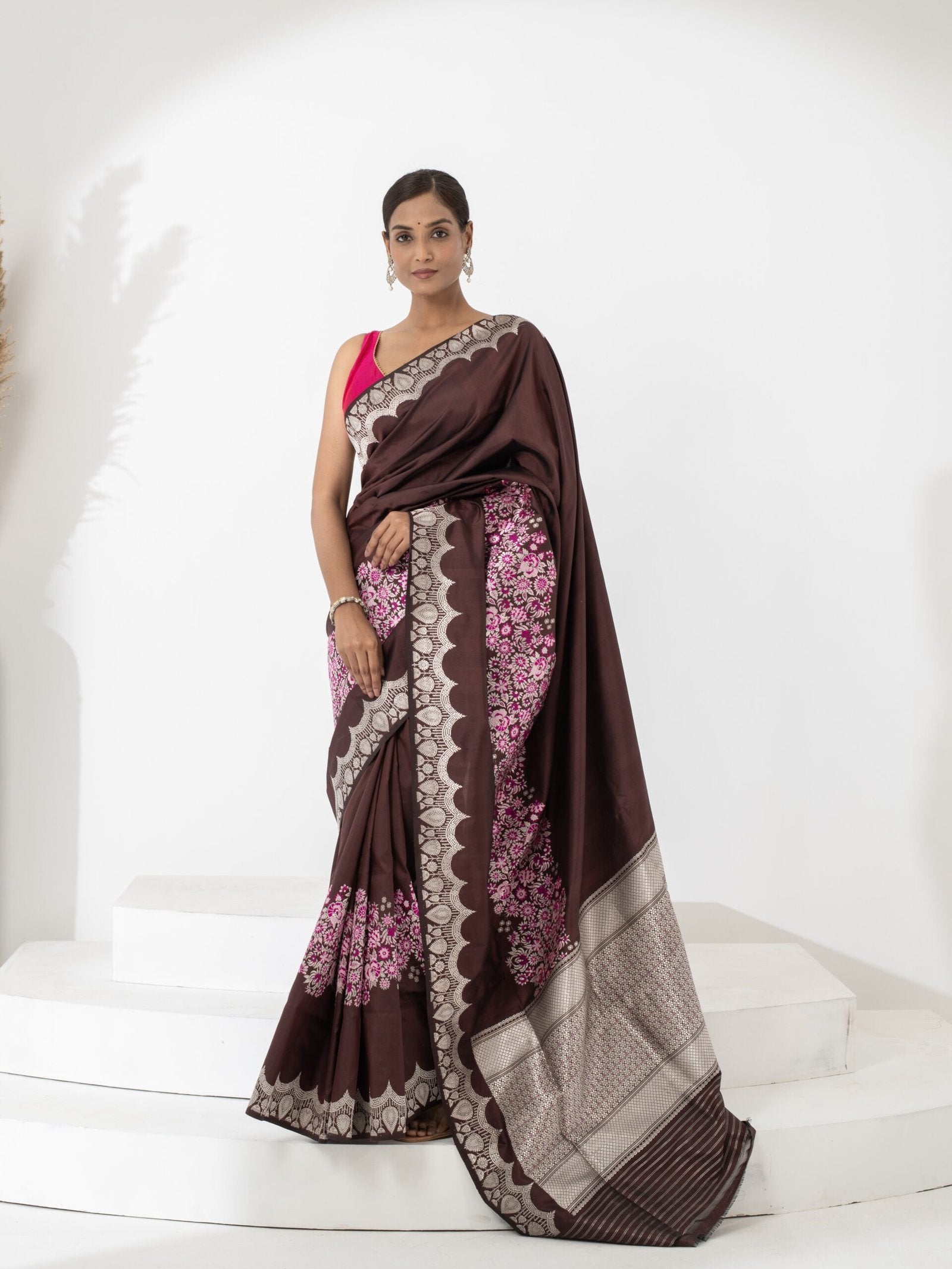 The Iktara silk used in this saree is known for its lightweight, fluid texture and subtle sheen, which lends the saree a luxurious yet breathable feel — perfect for long traditional events or grand celebrations. The brown hue evokes a warm, earthy elegance that pairs seamlessly with gold or contrast accessories, making it versatile for festive wear or ceremonial occasions.