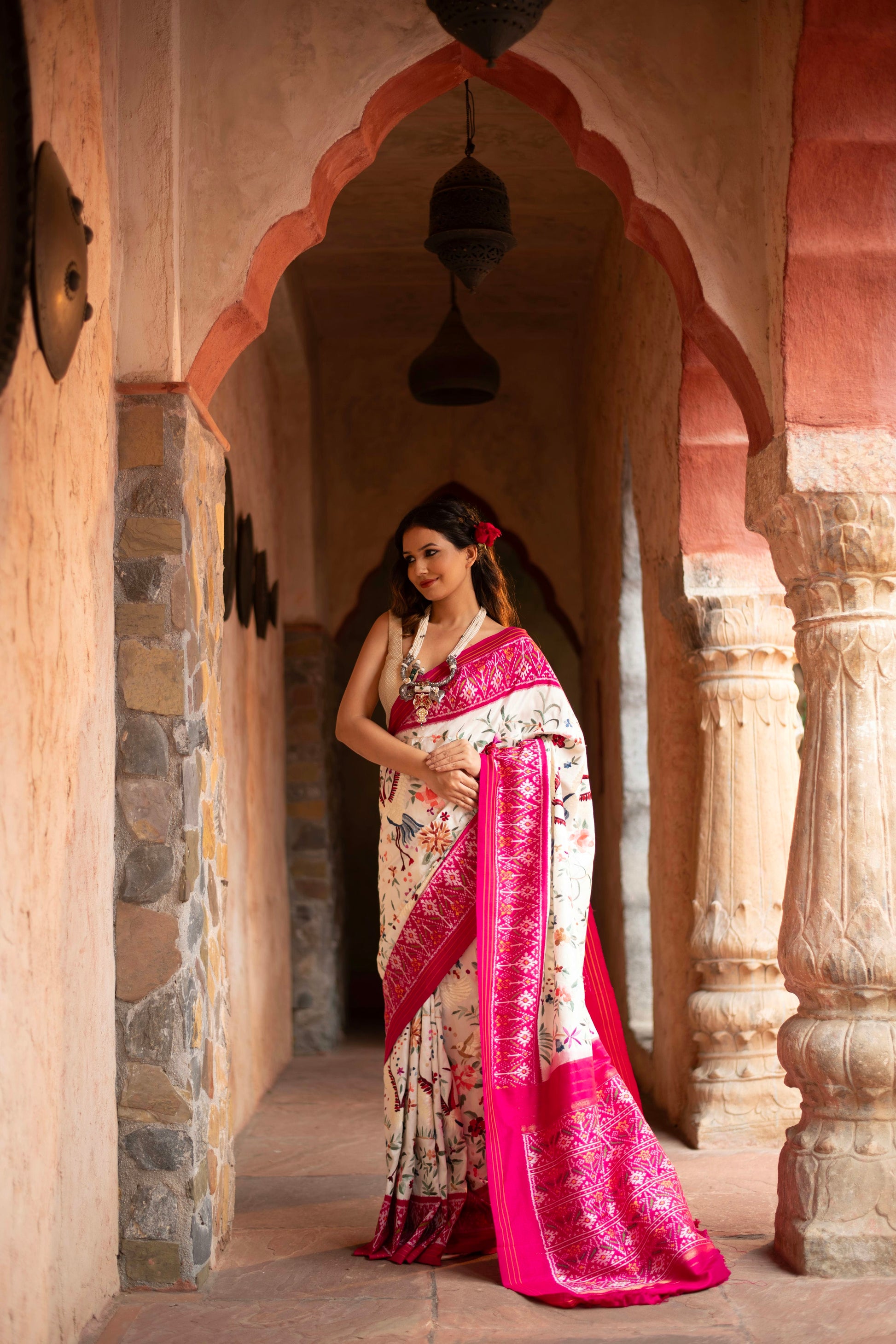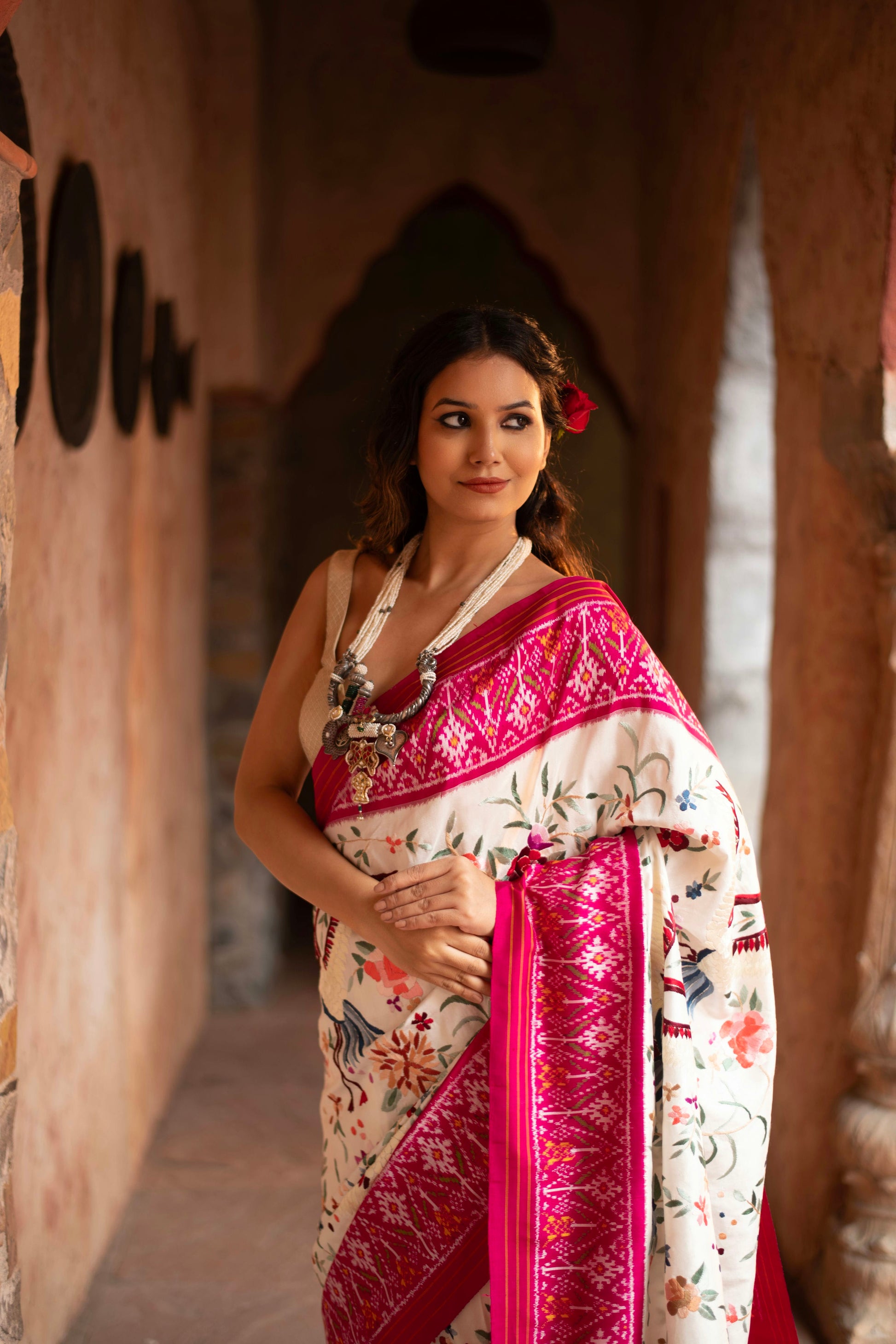 Twill Ikkat Saree with Hand-Embroidered Parsi Gara