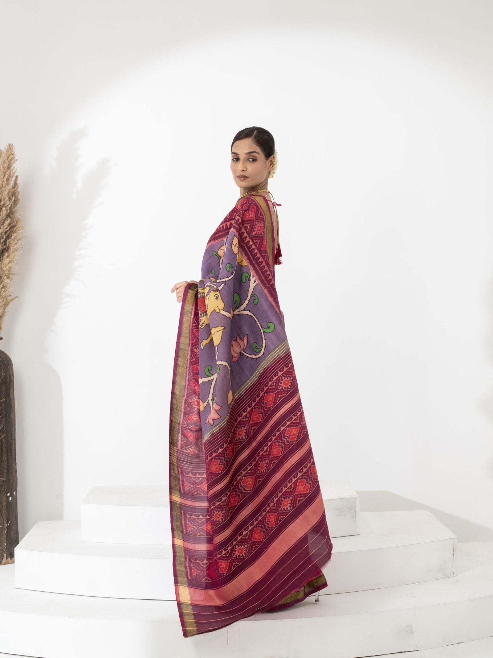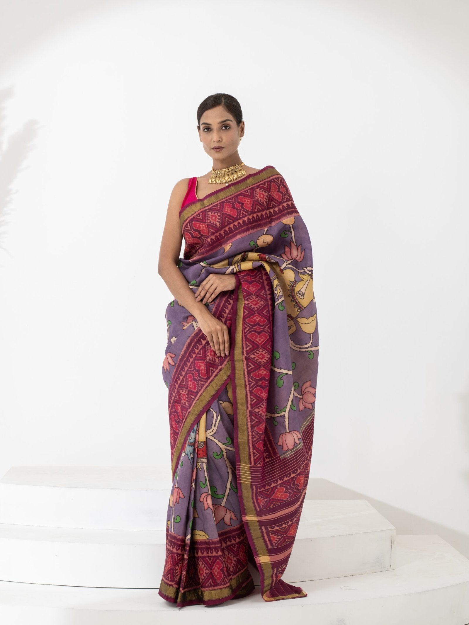 Woven in rich Patola silk, the saree boasts a lustrous finish and structured drape. The hand-painted Kalamkari work is executed using natural dyes and traditional techniques, making every piece truly one of a kind.