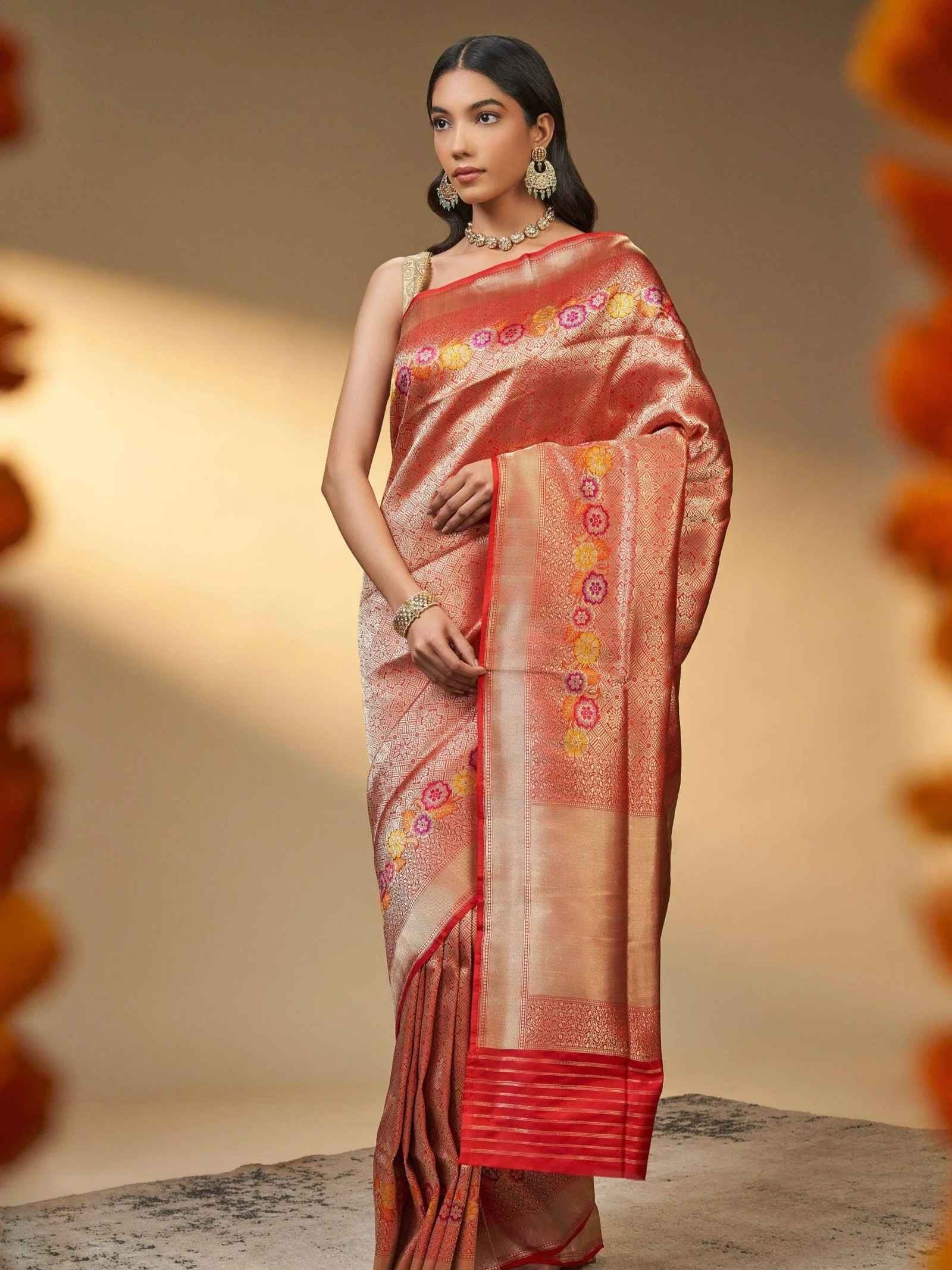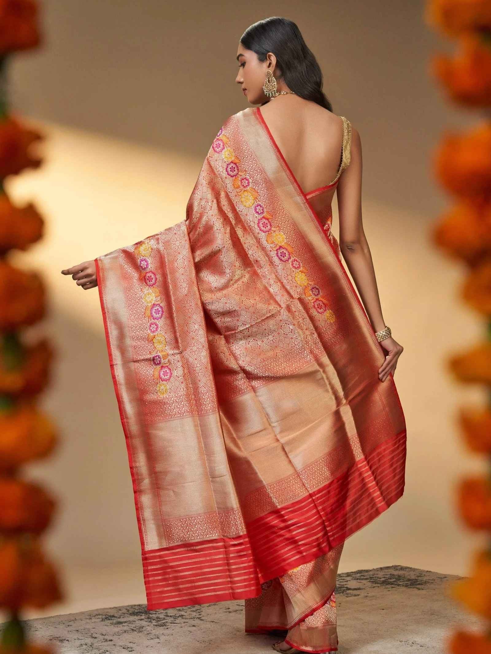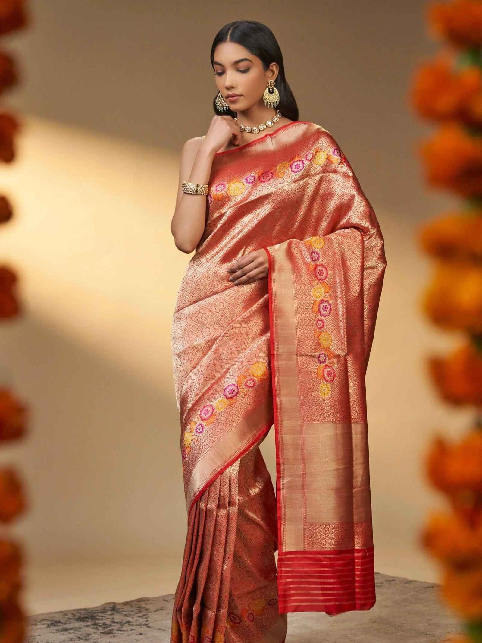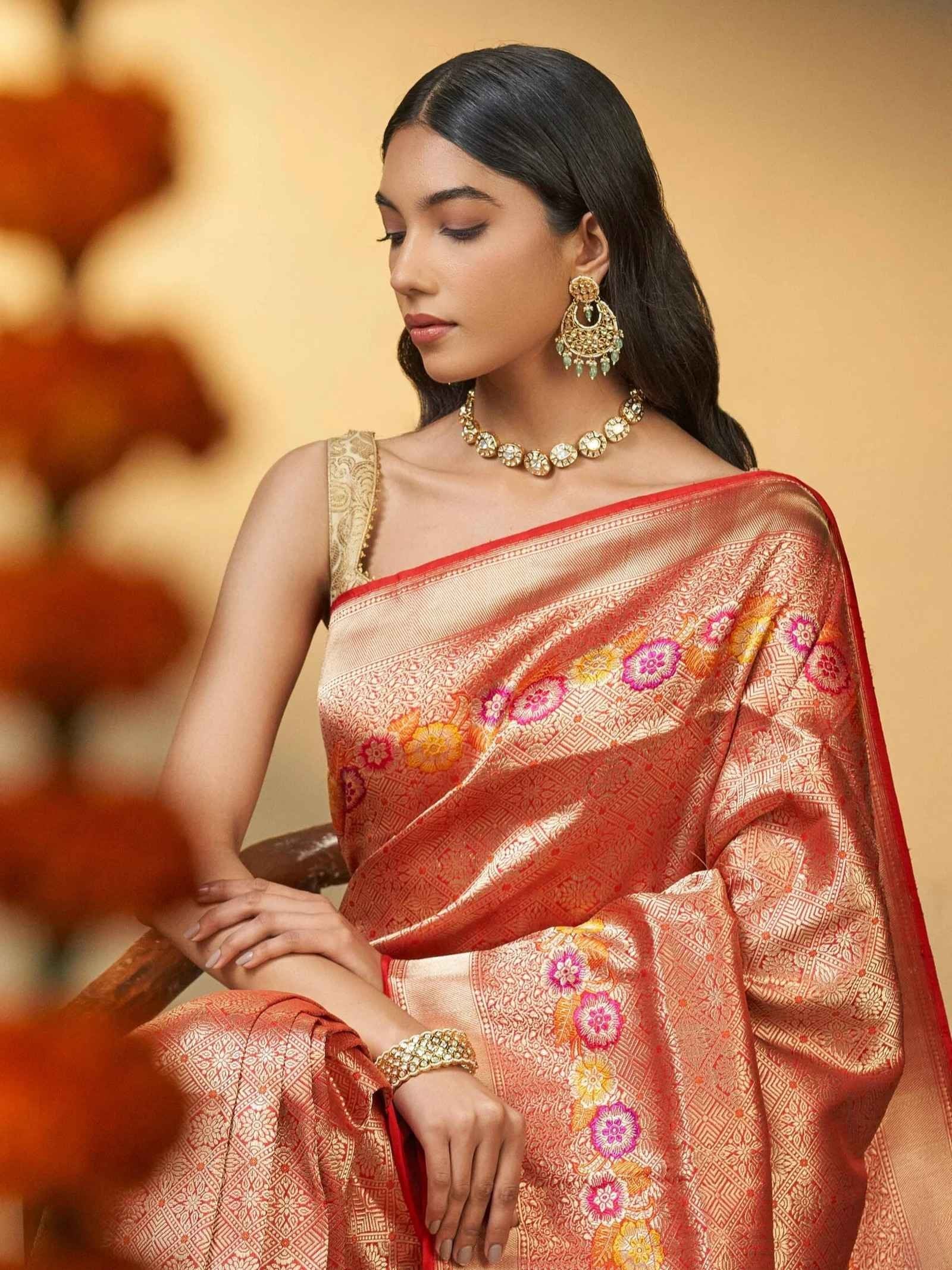The luxurious brocade fabric lends a royal texture to the ensemble, while the vivid red tone creates an unmistakable aura of bridal magnificence. At the heart of Vaibhavi’s charm lies its Meenakari floral skirt border – a true work of art. Woven to replicate the finesse of hand embroidery, this border gives the saree an added depth of intricacy, beauty, and artisan skill. Every thread tells a story of craftsmanship rooted in centuries of Indian weaving traditions.