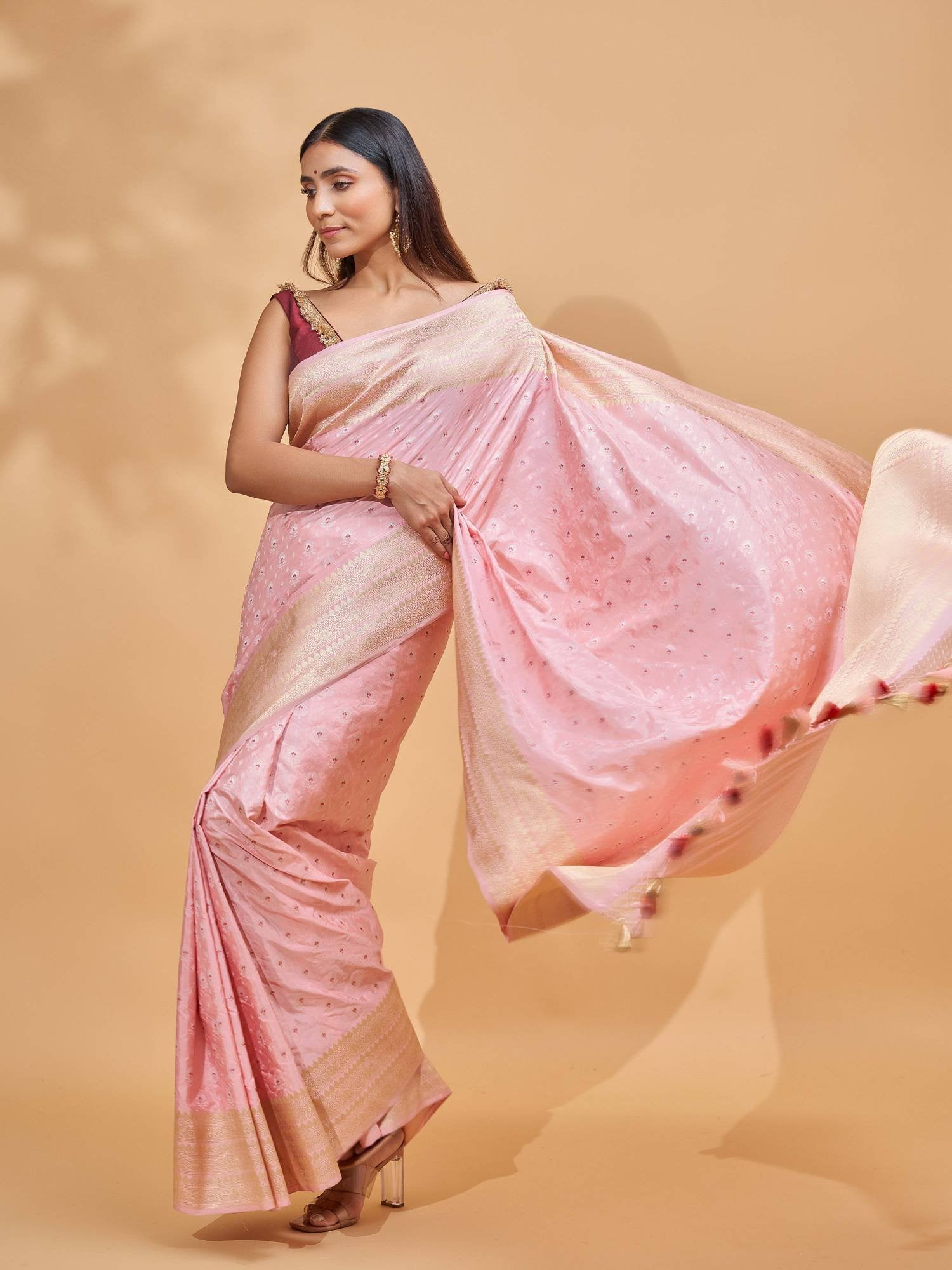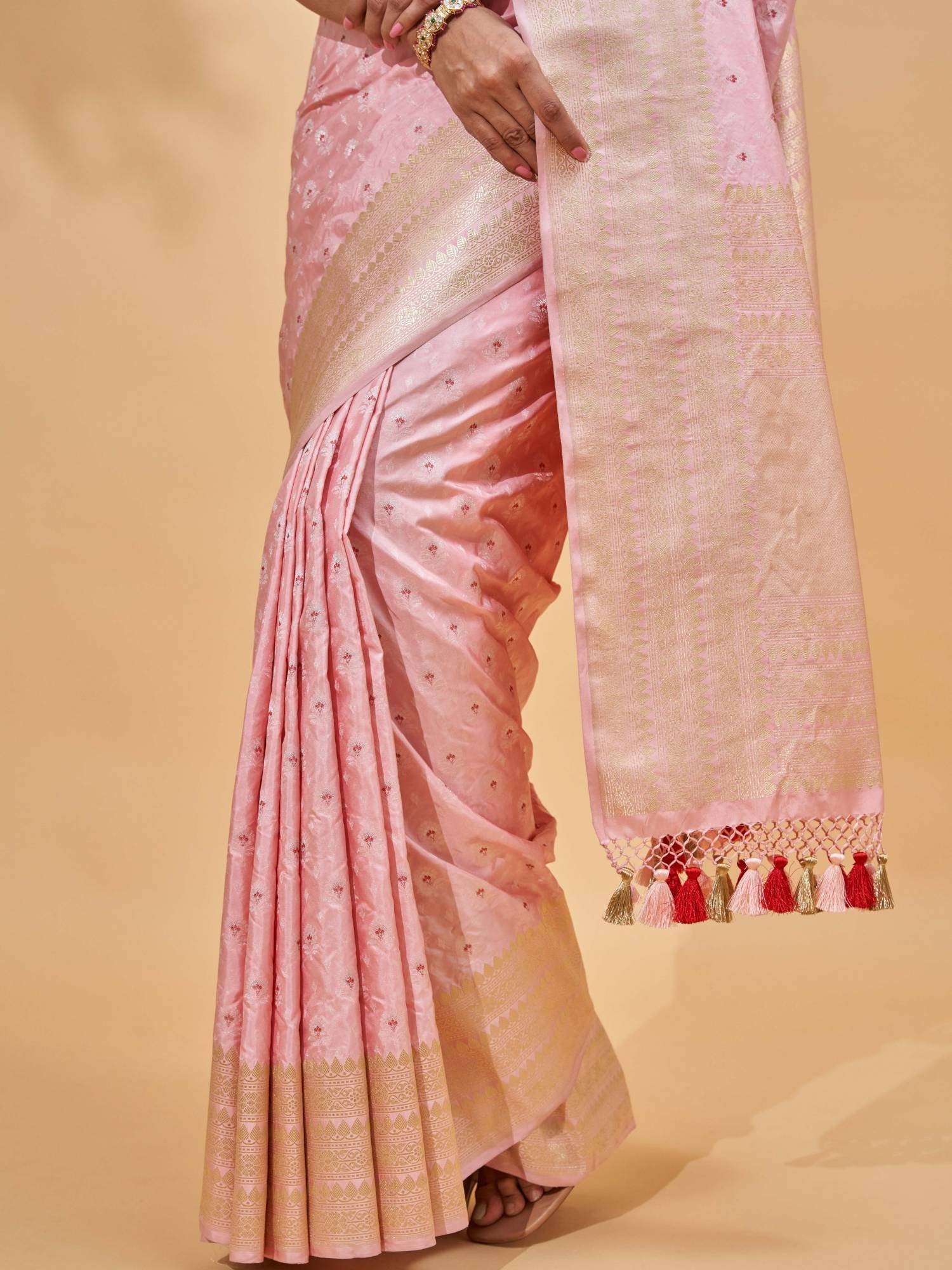 The body of the saree is adorned with shimmering rupa zari bootis, gracefully scattered across the silk surface to catch the light with every movement. The hint of red meenakari adds a layer of intricate detailing, beautifully balancing the delicate pink with a pop of richness. A lavishly crafted pallu, resplendent in zari artistry, completes the ensemble — making it not just an outfit, but a piece of wearable heritage.