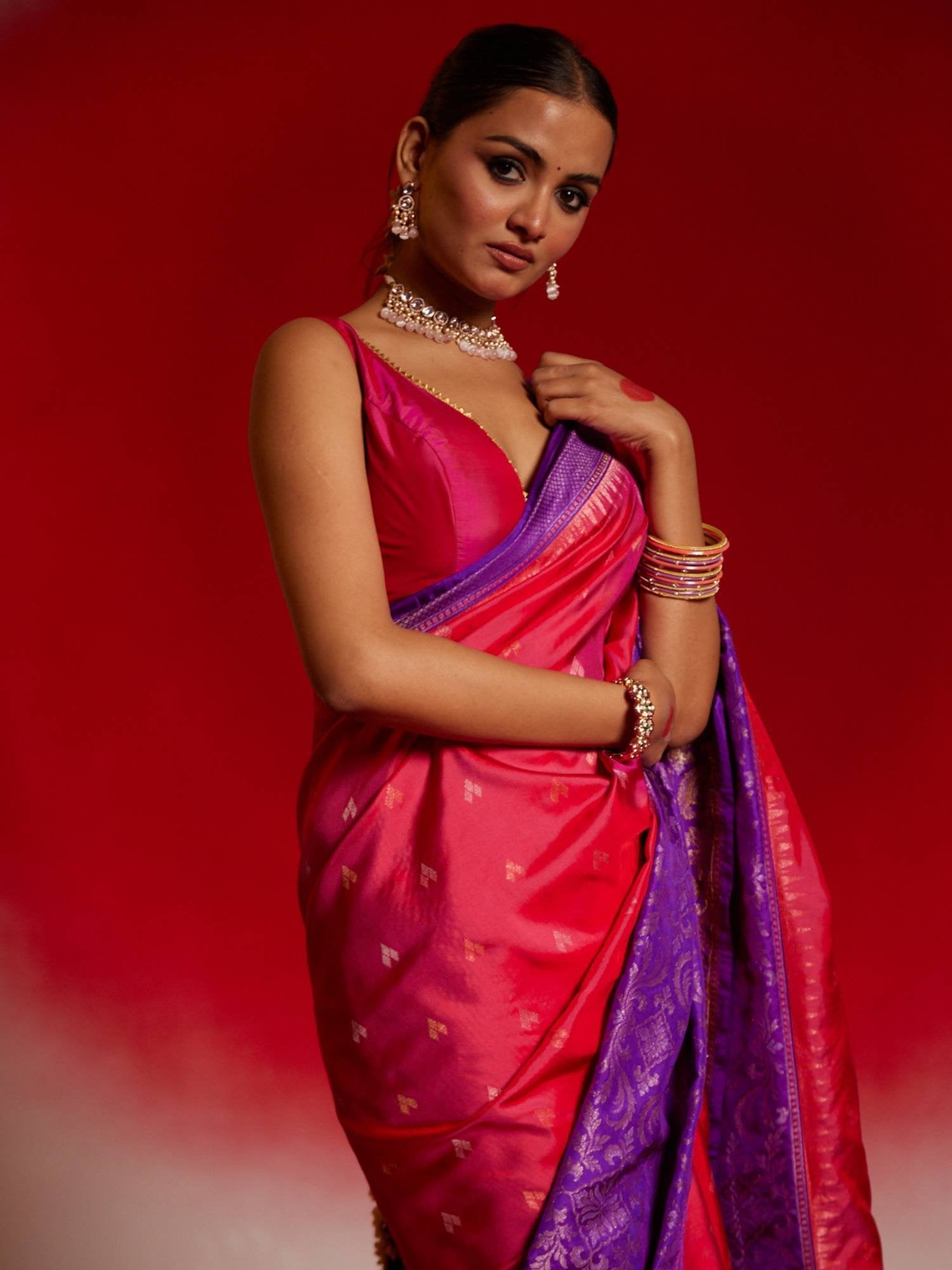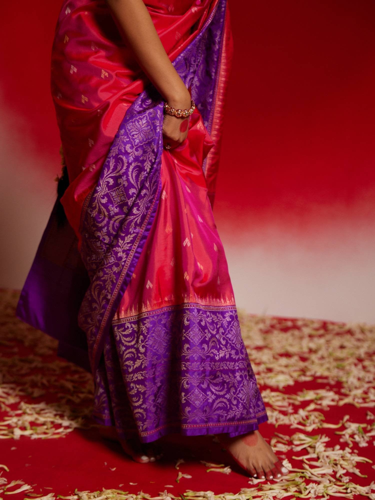 The Vritika (Pink Iktara Silk Jamdani Saree) is a masterpiece that celebrates the rich heritage of Indian textile art. Crafted in luxurious Pure Iktara Silk, this saree is adorned with an all-over subtle zari weave that lends a soft shimmer and regal grace to its body. The true showstopper is its contrasting pallu, intricately woven in the timeless Jamdani technique—one of the most revered and labor-intensive forms of weaving with its origins rooted in Dhaka, Bangladesh.