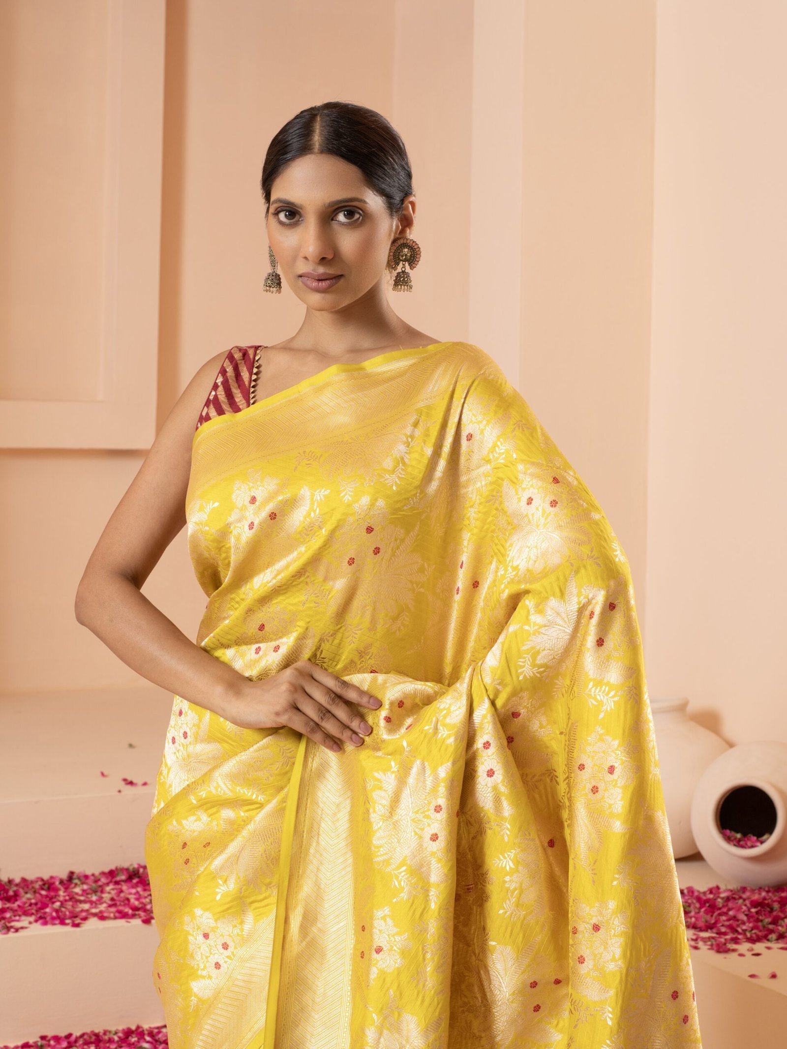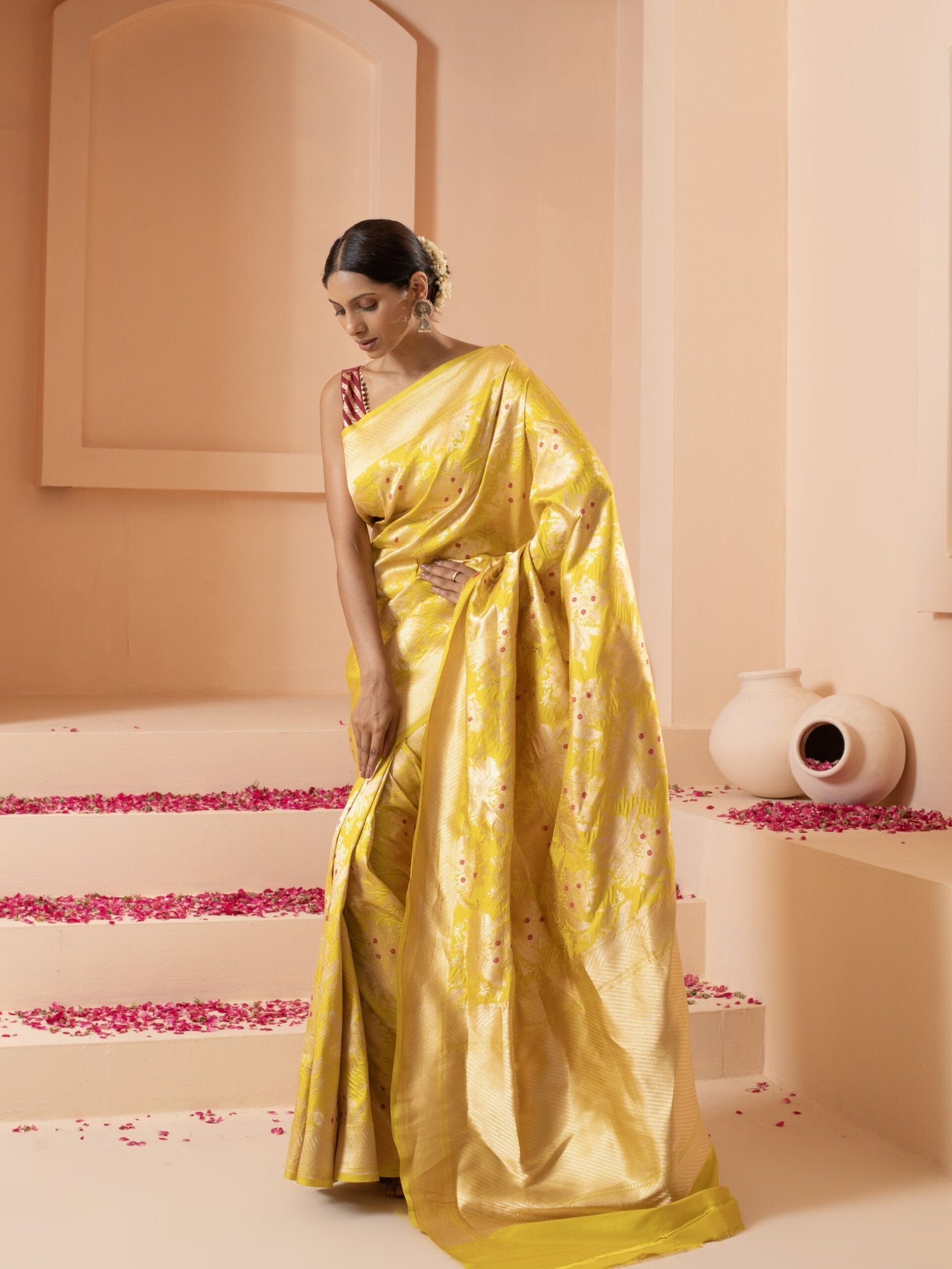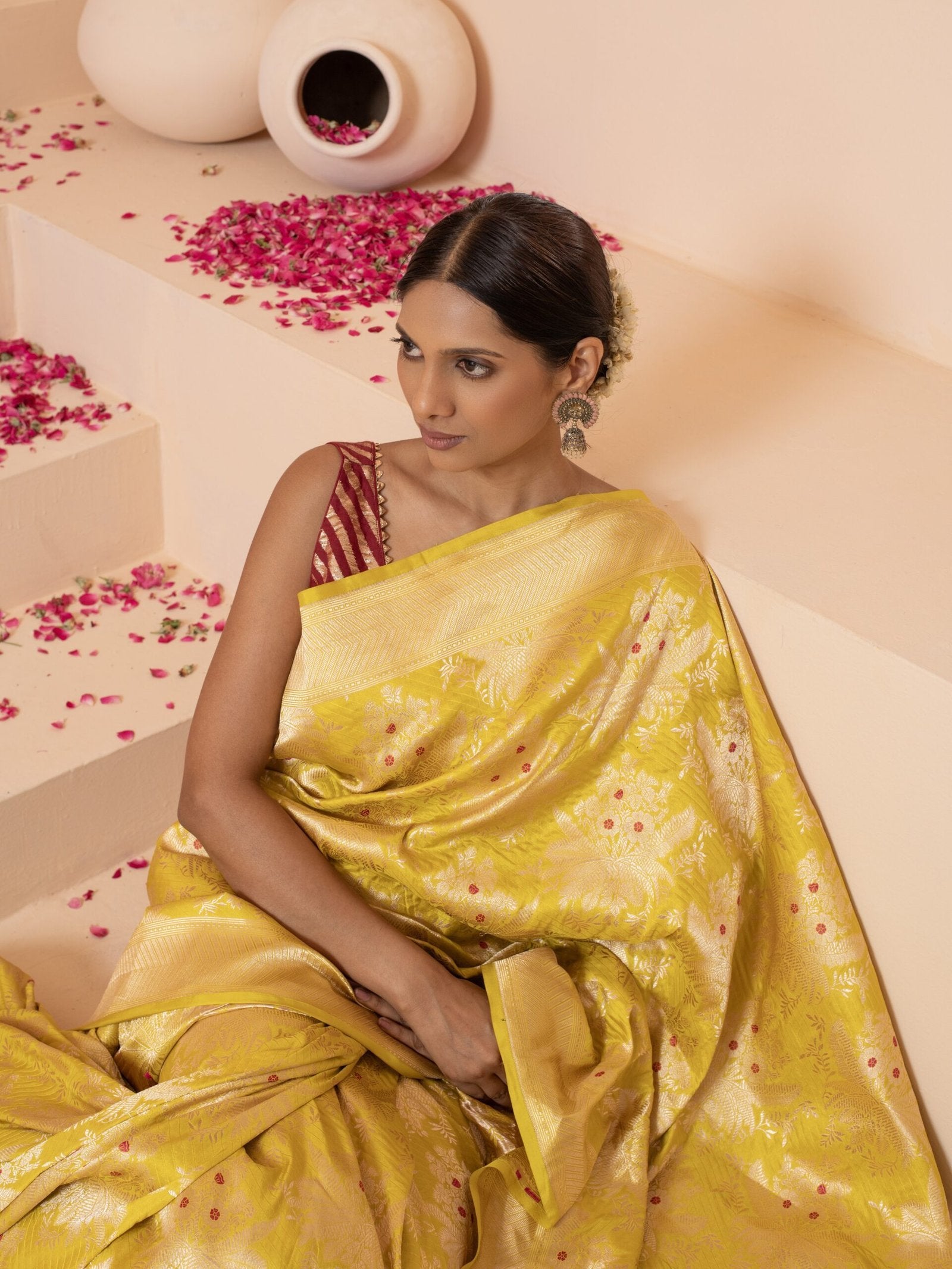 Immerse yourself in the brilliance of Banarasi craftsmanship with the Yamuna (Neon Green Meenakari Boota Saree). This radiant drape is a celebration of tradition wrapped in a bold neon green hue, redefining elegance with a modern flair. The saree features an allover floral bunch boota design, intricately detailed with meenakari accents that dance across the body, offering a vibrant interplay of colors and textures.