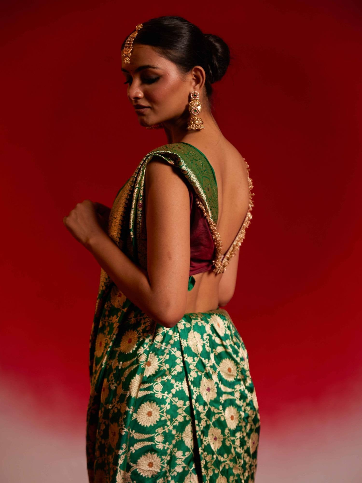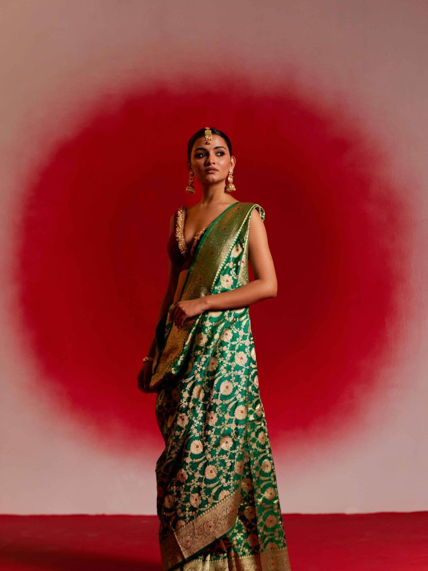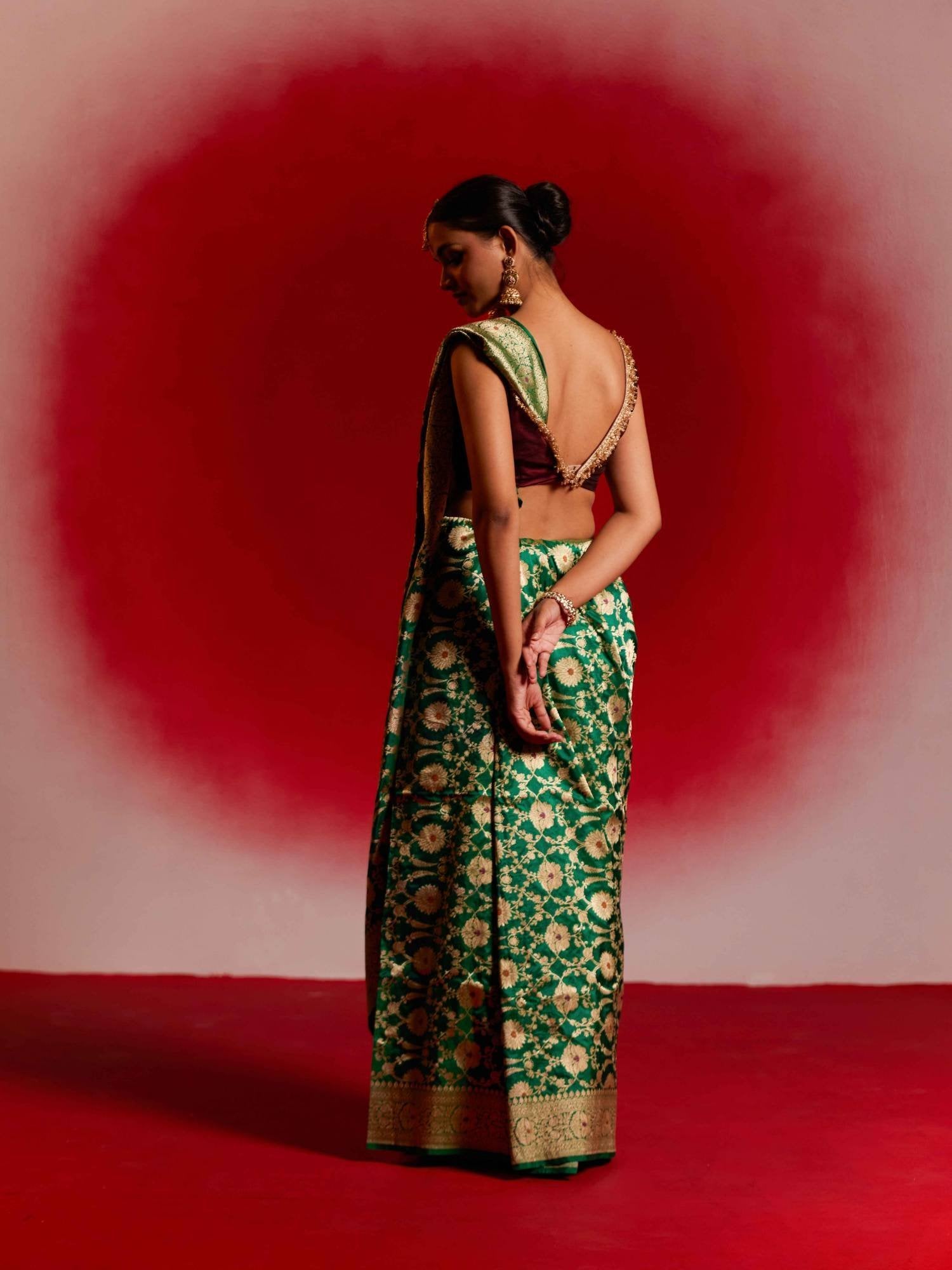 Let your wardrobe speak of your refined taste in heritage weaves. Own a piece of Banarasi history with this emerald jewel that promises to be cherished for generations.