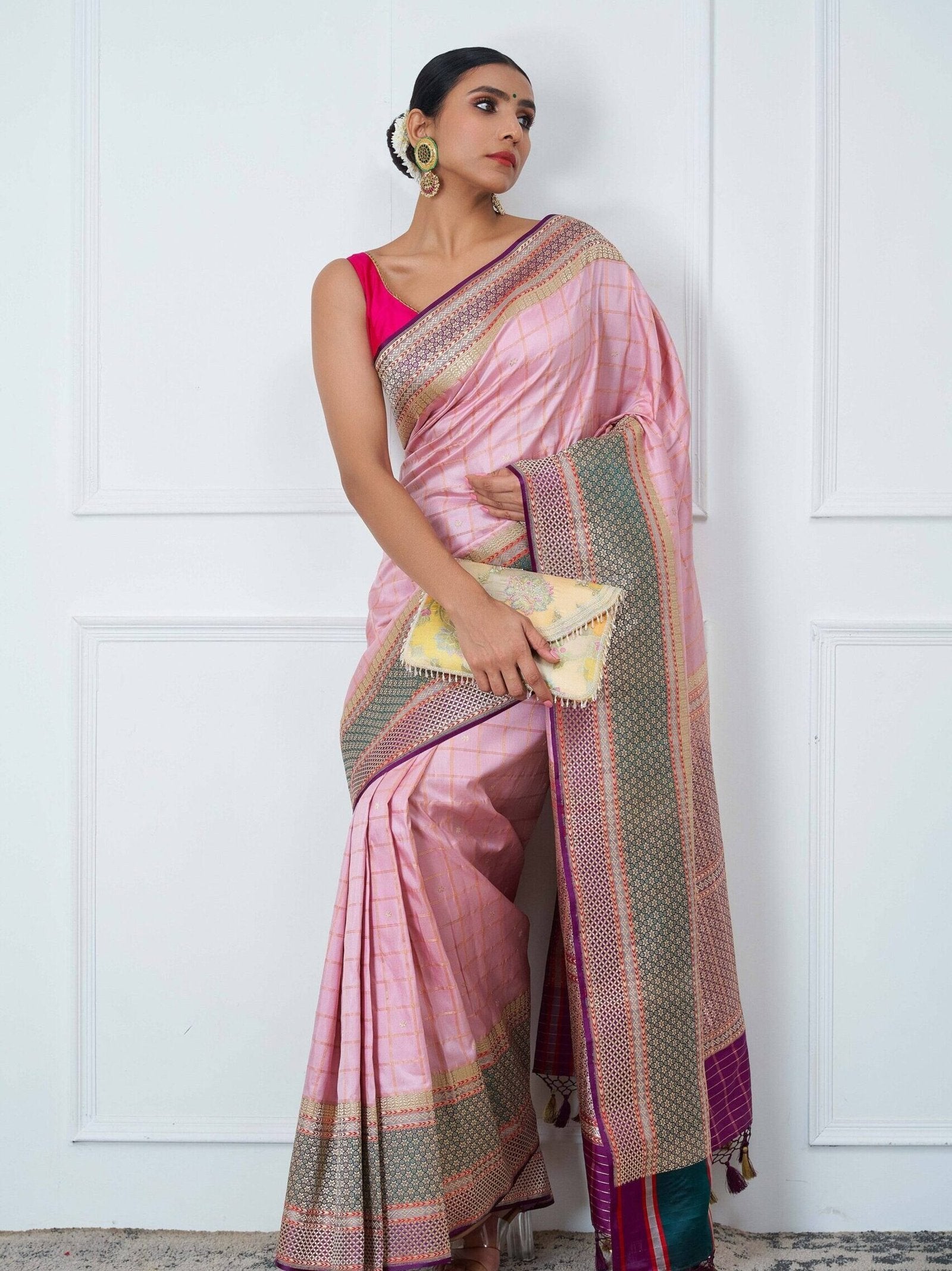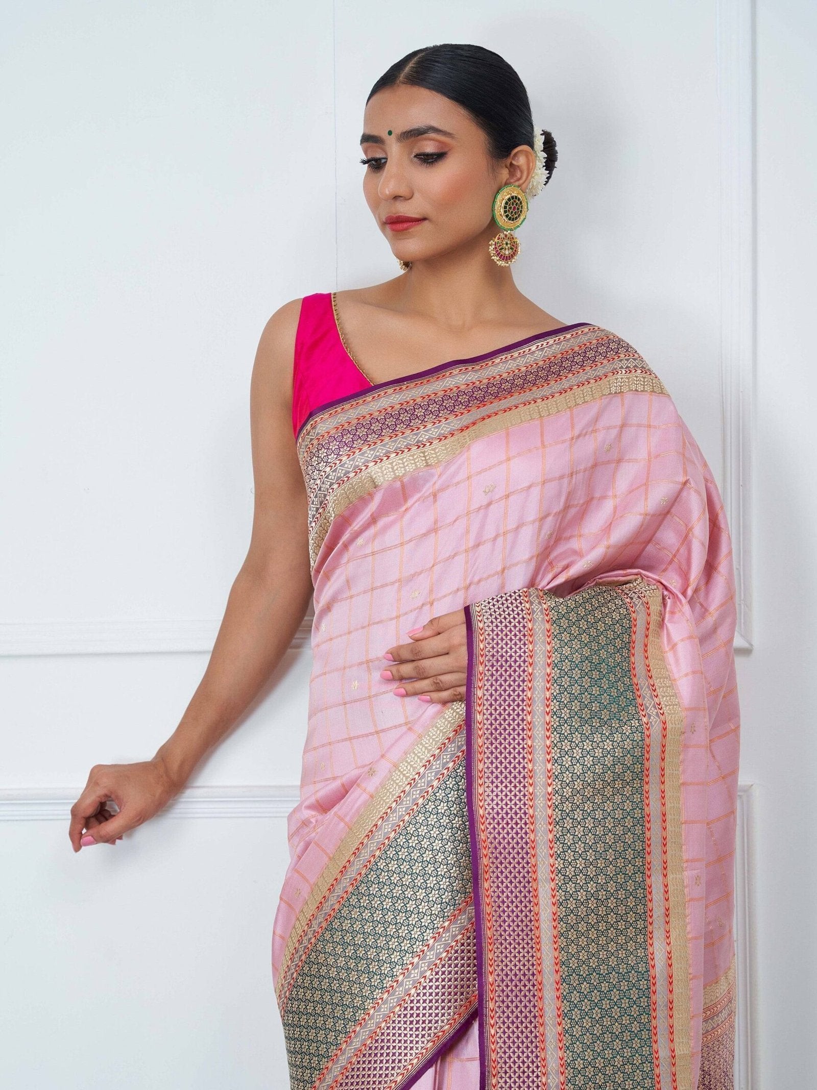 The body of the saree is adorned with allover Zari checks, finely woven using the exquisite kadwa weave technique—a testament to the craftsmanship of our master artisans. The border and pallu showcase detailed vintage motifs, echoing the aesthetics of age-old royal drapes. The shimmering pink hue adds a romantic touch, making it both graceful and statement-worthy. Every inch of this saree resonates with cultural legacy and artistic storytelling.